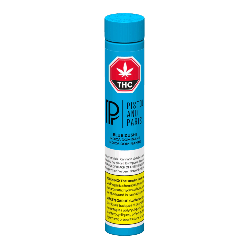Blue Zushi 3x0.5g pre-rolls are packed with expertly milled whole flower and hand-finished with a Dutch crown. This Zkittlez x Kush Mintz cross features bold, gassy aromatics and a smooth, sweet tropical flavour in a convenient three-pack. Pistol and Paris products are true craft cannabis-grown with care, attention, and intention. All crops are hang dried, cold cured, and hand trimmed to preserve quality. Every step is carefully done by hand to honour each unique cultivar and showcase its fullest expression.