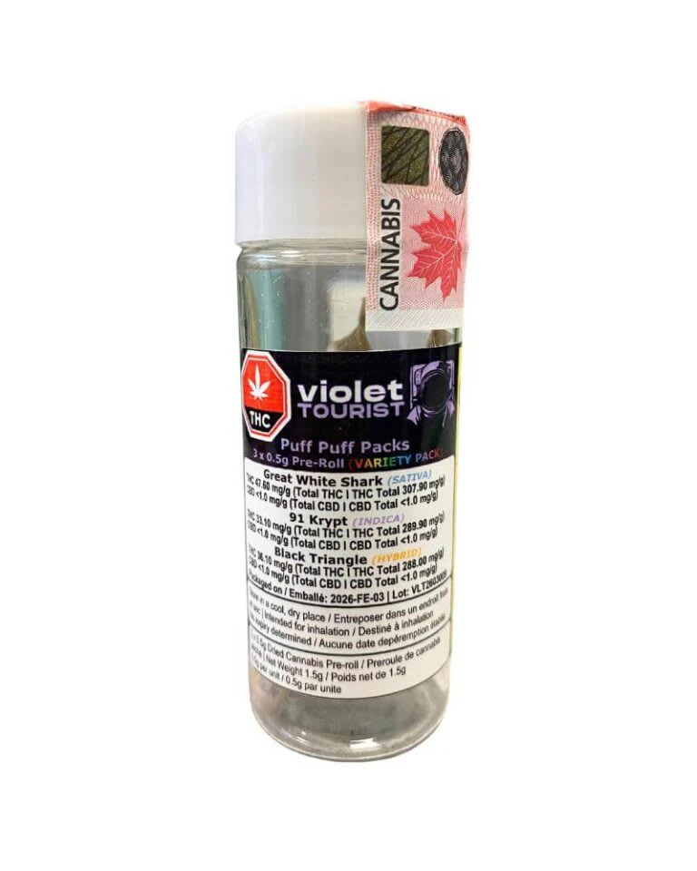 Embark on a full-spectrum adventure with Violet Tourist's Puff Puff Packs - a curated 3 x 0.5g PreRoll Joints (PRJs) multipack featuring one hybrid, one sativa, and one indica. Perfect for mood-matching any moment. Grown in a state-of-the-art indoor facility in Alberta, Canada, each pre-roll is handcrafted with organic hemp papers and finely milled flower for smooth, consistent burns. Discover three distinct flavor journeys